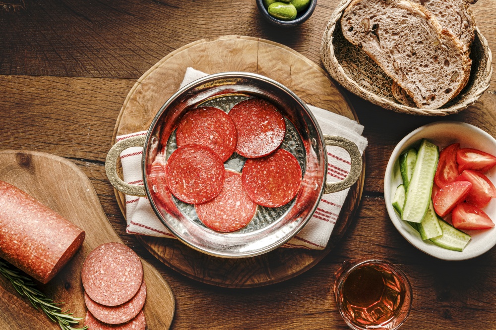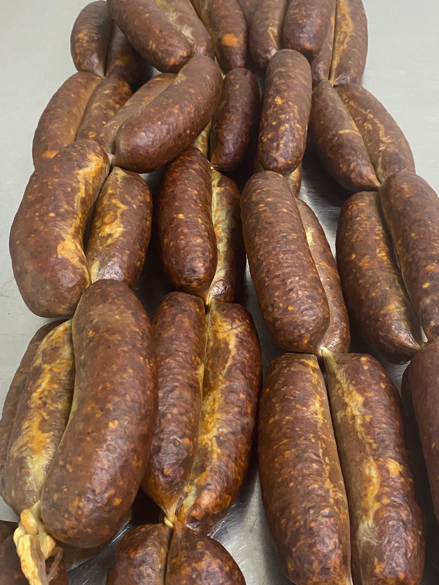 Çeşitli baharatlarla çeşnilendirilmiş sucuk harcı, doğal bağırsağa doldurulur ve geleneksel fermente odalarında 15 gün dinlendirilir.